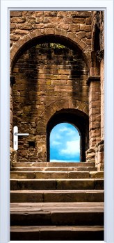 Dla poszukujących przestrzeni polecamy fototapety 3D na drzwi. Motywy takie jak schody prowadzące do ogrodu, tajemnicze uliczki czy widok na morze, tworzą niesamowitą iluzję głębi, sprawiając, że pokój wydaje się większy.